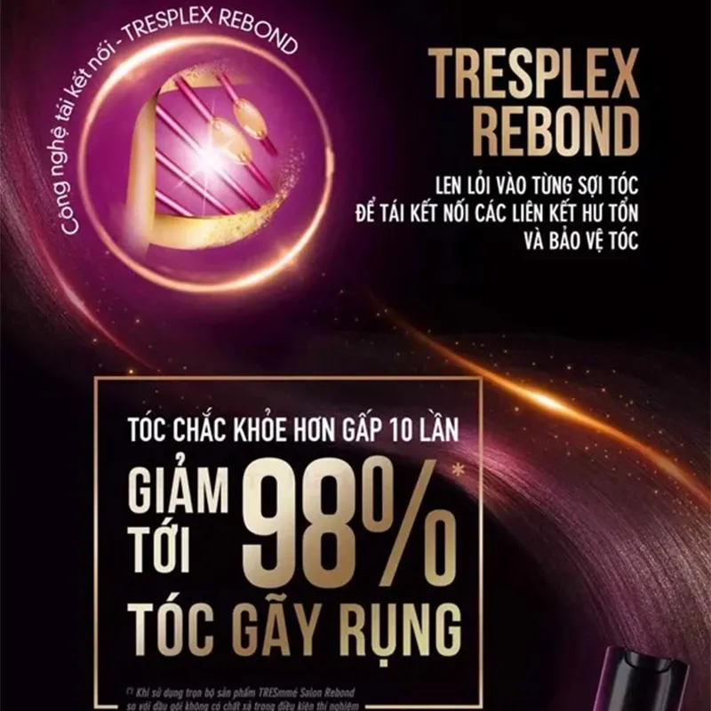 Dầu Gội Tresemme Salon Rebond Ngăn Tóc Hư Tổn Gãy Rụng 850g với công nghệ tái kết nối - TRESplex Rebond TM giúp len lỏi vào từng sợi tóc để tái kết nối các liên kết hư tổn và bảo vệ tóc, cho tóc chắc khỏe hơn gấp 10 lần, giảm gãy rụng tới 98%.
