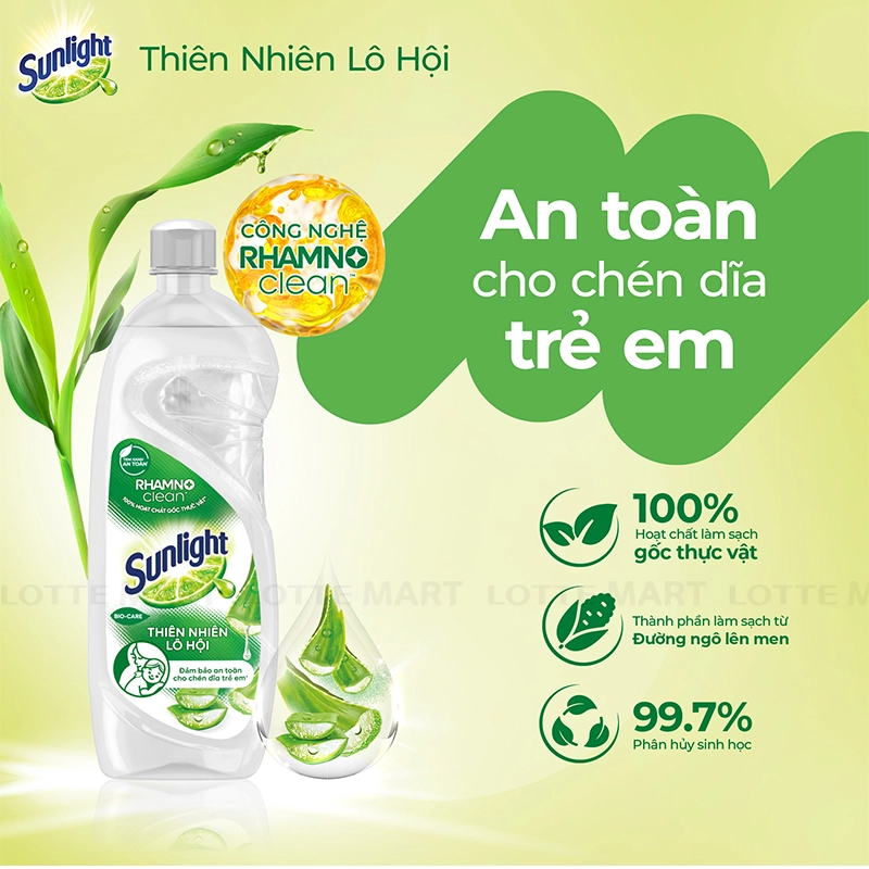 Nước Rửa Chén Sunlight Thiên Nhiên Hương Lô Hội là sản phẩm mới của nhà Sunlight - nước rửa chén bát Sunlight Bio-care mới với công nghệ độc quyền Rhamno Clean chứa 100% hoạt chất làm sạch gốc thực vật. Với cải tiến trong công thức, Sunlight Bio-care mới mang đến chuẩn mực an toàn mới, đảm bảo an toàn cho chén dĩa trẻ em và thân thiện với môi trường.
