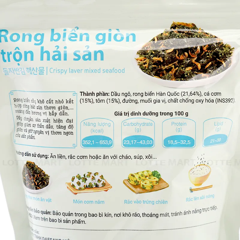 Thành phần: Dầu ngô, rong biển Hàn Quốc (21.64%), cá cơm (15%), tôm (15%), đường, vừng, dầu mè, muối gia vị (3.4%), chất chống oxy hóa (E392)...