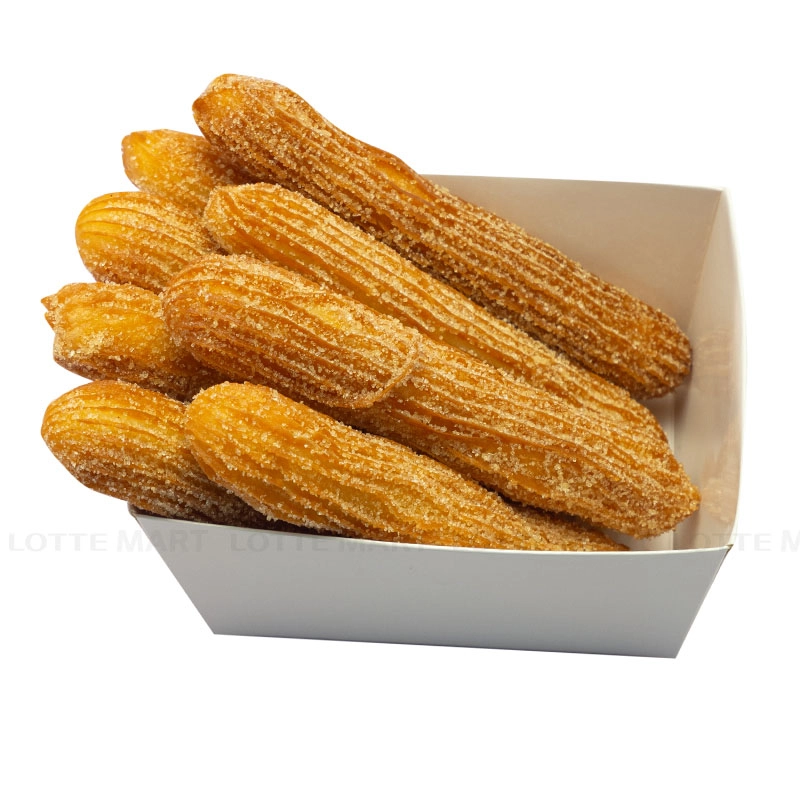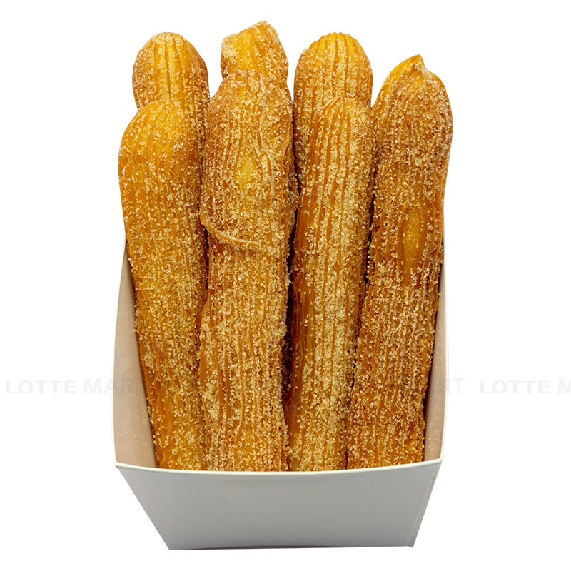 Bánh Churros Phủ Đường với hình dạng thanh dài, thẳng với các đường rãnh rõ rệt dọc thân bánh, trên bề mặt được phủ thêm một lớp đường nâu.