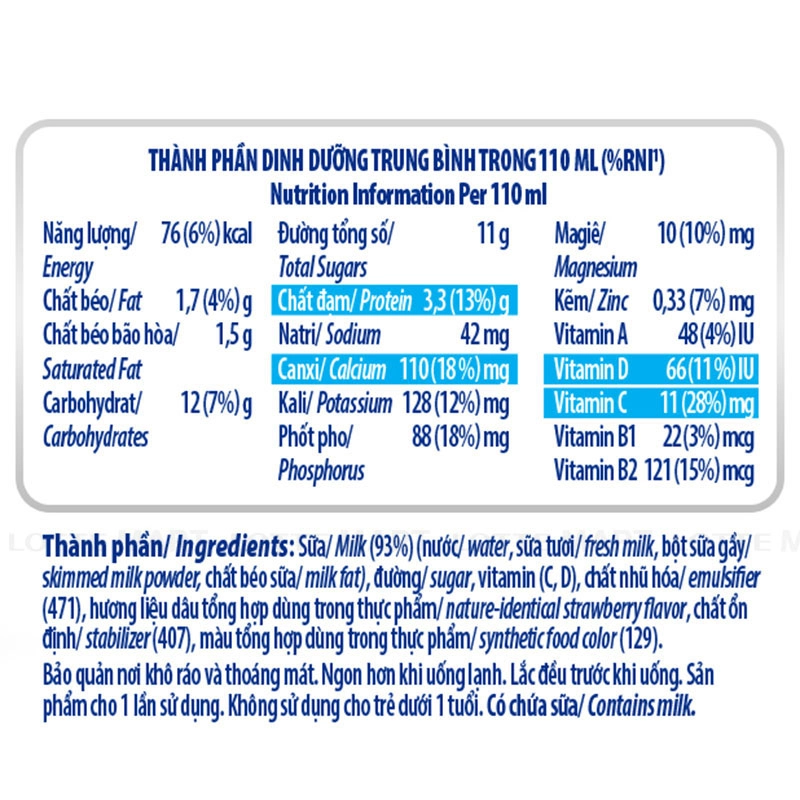 Thành phần: Nước, sữa tươi, bột sữa, đường, chất béo sữa, hương dâu tự nhiên