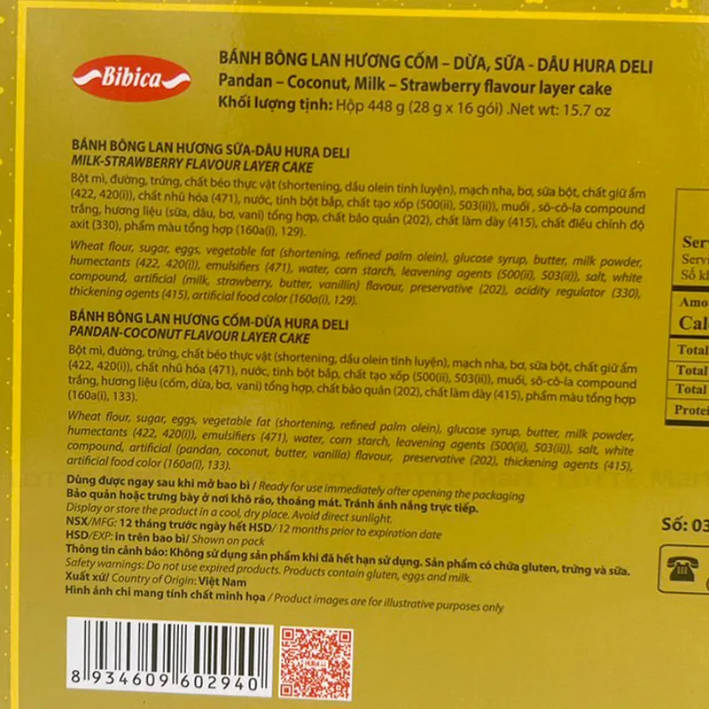 - Bánh bông lan sữa dâu - Bột mì, đường, trứng, chất béo thực vật, muối, socola trắng, hương (sữa, dâu, bơ vani) tổng hợp, chất bảo quản,...