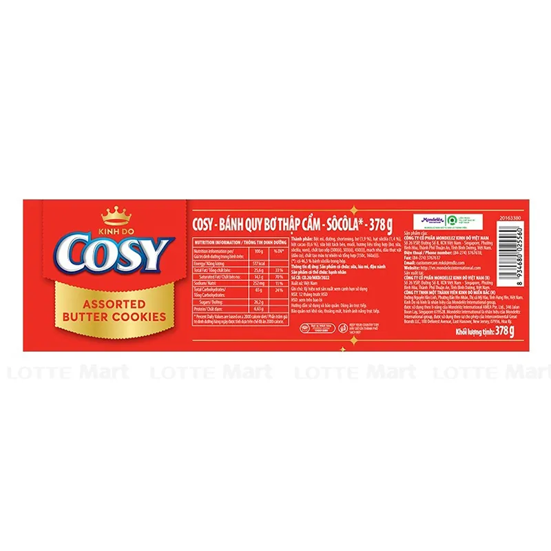 - Bánh Quy Cosy Socola Hộp Thiếc 378G của thương hiệu Kinh Đô được làm từ những nguyên liệu tự nhiên được chọn lọc kỹ lưỡng, mang đến chất lượng và mùi vị tuyệt hảo. Ngoài ra, với công nghệ sản xuất hiện đại, sản phẩm cũng đạt tiêu chuẩn vệ sinh thực phẩm, an toàn cho sức khỏe người dùng.