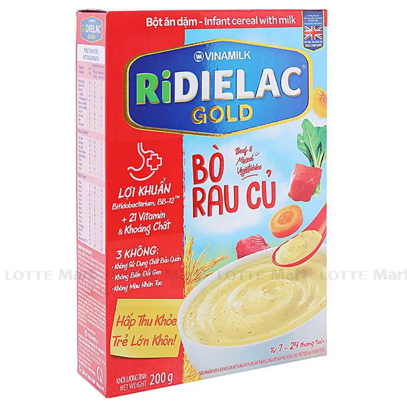 - Bột Ăn Dặm Ridielac Gold Bò Rau Củ được nghiên cứu bởi các chuyên gia từ Trung tâm nghiên cứu dinh dưỡng và phát triển sản phẩm Vinamilk, đáp ứng nhu cầu dinh dưỡng cho trẻ từ 7 đến 24 tháng tuổi, giúp bổ sung vi chất dinh dưỡng, hỗ trợ bé phát triển thể chất trong thời gian ăn dặm.