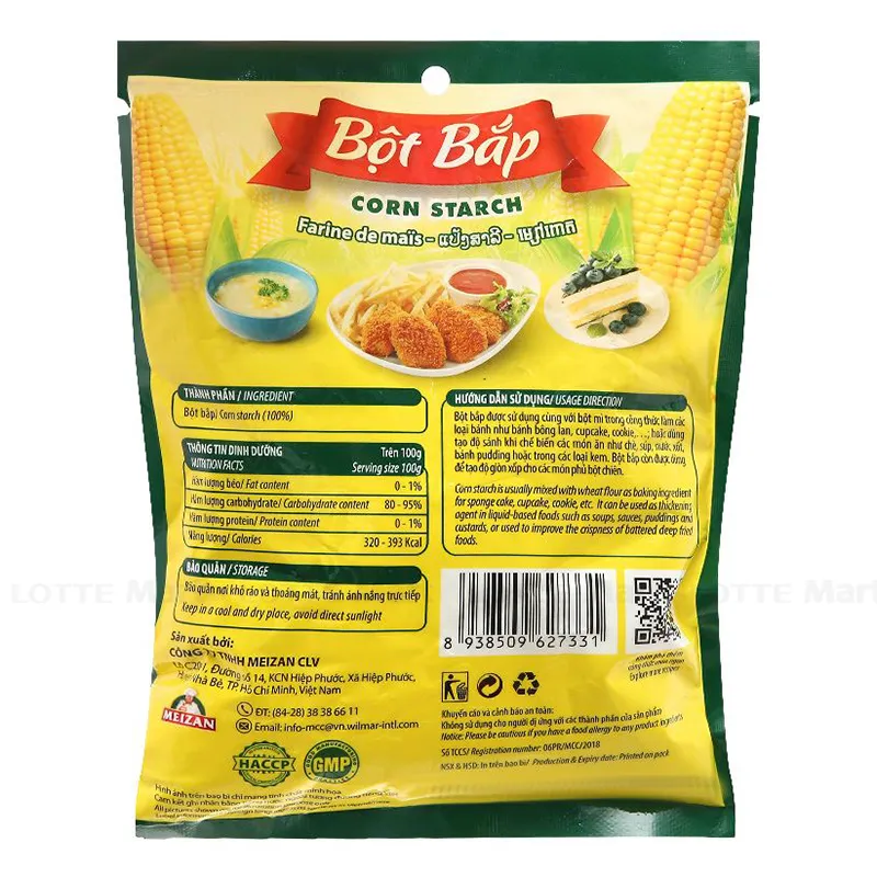 - Bột bắp còn được dùng để tạo độ giòn xốp cho các món phủ bột chiên. Thành phần: Bột mì, bột gạo, tinh bột bắp, muối i-ốt, chất tạo xốp…
