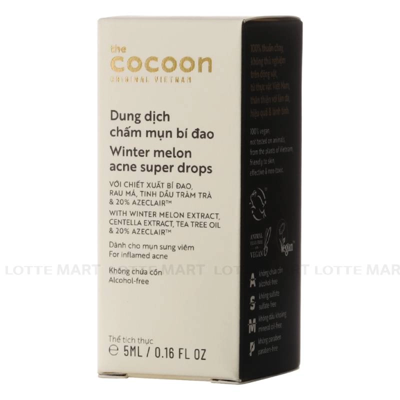 - Dung Dịch Chấm Mụn Cocoon Chiết Xuất Bí Đao Làm Giảm và Ngừa Mụn là sản phẩm đến từ thương hiệu mỹ phẩm thuần chay Cocoon. Dung dịch chấm mụn bí đao không chứa cồn cùng với những thành phần chủ đạo gồm bí đao, rau má và tràm trà, bổ sung tăng cường với 20% Azeclair™ có công dụng làm giảm mụn sưng viêm, làm mờ các vết thâm.