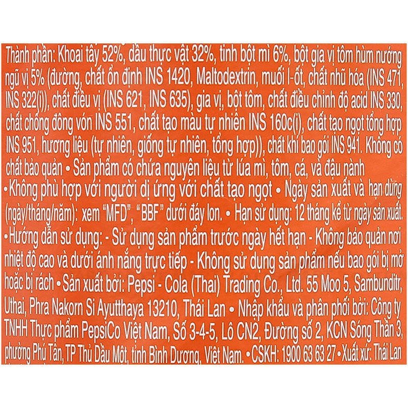 - Khoai tây 52%, dầu thực vật 32%, tinh bột mì 6%, bột gia vị tôm hùm nướng ngũ vị 5%,…(Chi tiết trong HSCB).