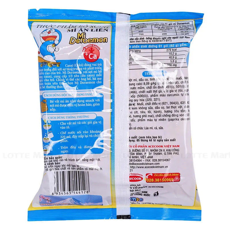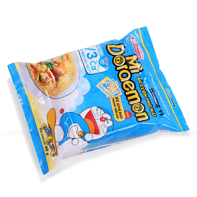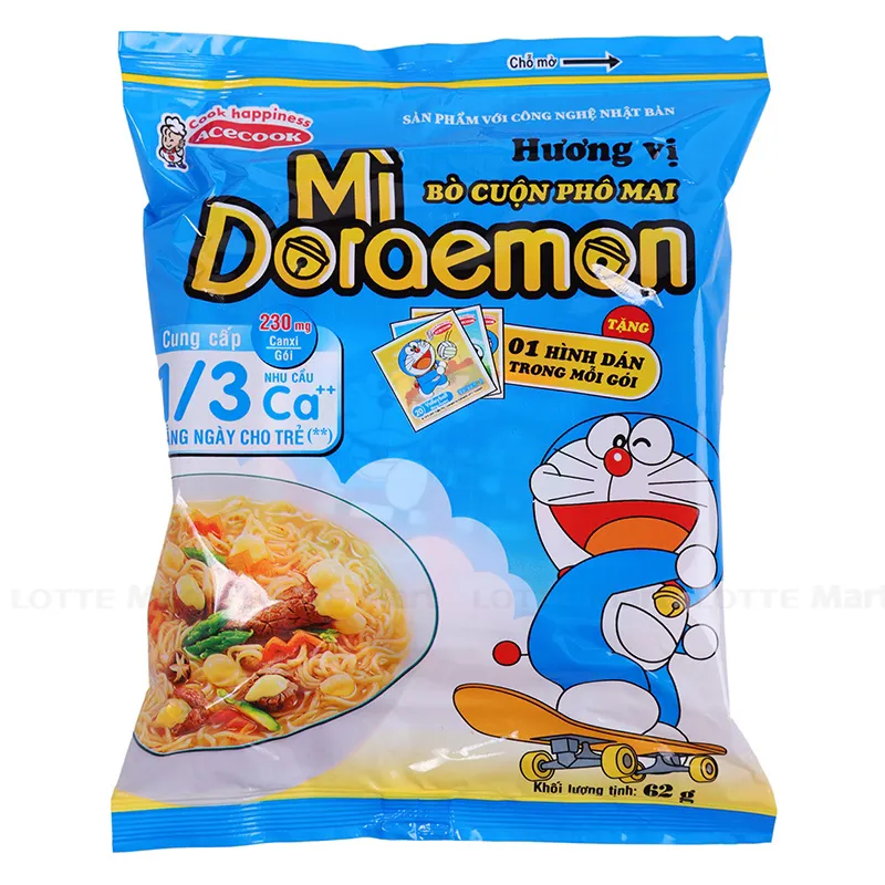Mì Doremon Bò Cuốn Phô Mai Gói 62g thơm ngon, mới lạ, cung cấp năng lượng, canxi cho cơ thể, mì có vàng dai ngon hòa quyện trong nước súp hương vị bò cuộn phô mai đậm đà thơm lừng quyến rũ.