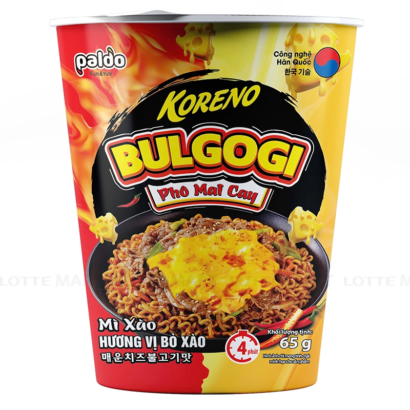 - Mì Xào Koreno Vị Bò Bulgogi Phô Mai Cay với từng sợi mì xào dai giòn bóng bẩy, vừa thấm đẫm gia vị Bulgogi thơm lừng, lại thêm mùi phô mai ngậy béo, càng ăn càng cuốn đến tận miếng cuối cùng.