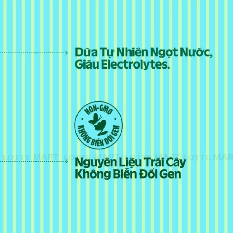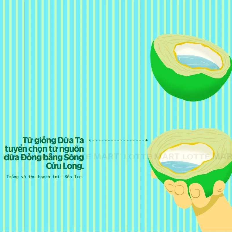 Thành phần: Nước dừa tươi (98%), đường, hương liệu tự nhiên, chất chống oxy hóa (300), chất điều chỉnh độ axit (330).