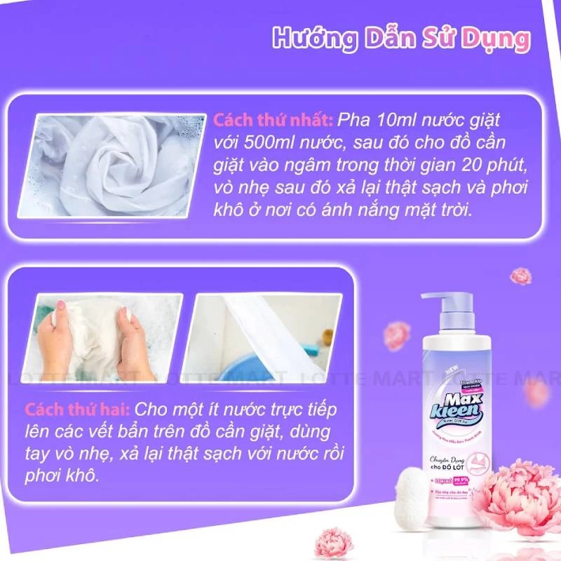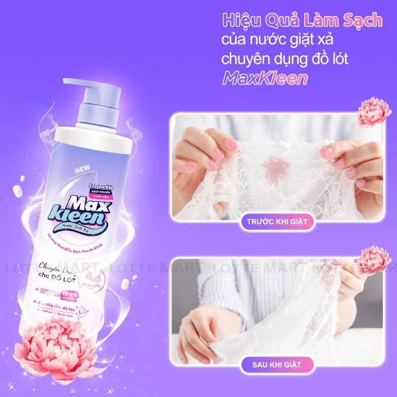 - Nước Giặt Đồ Lót MaxKleen Hương Hoa Mẫu Đơn sản xuất với công nghệ Enzyme kép mạnh mẽ làm sạch chuyên sâu đến 99,9% nấm khuẩn, vết bẩn, vết ố vàng, vết máu và dịch tiết trong chu kì, giữ cho đồ lót sạch nấm khuẩn bám trên bề mặt đồng thời ngăn ngừa các nguy cơ gây viêm nhiễm phụ khoa.
