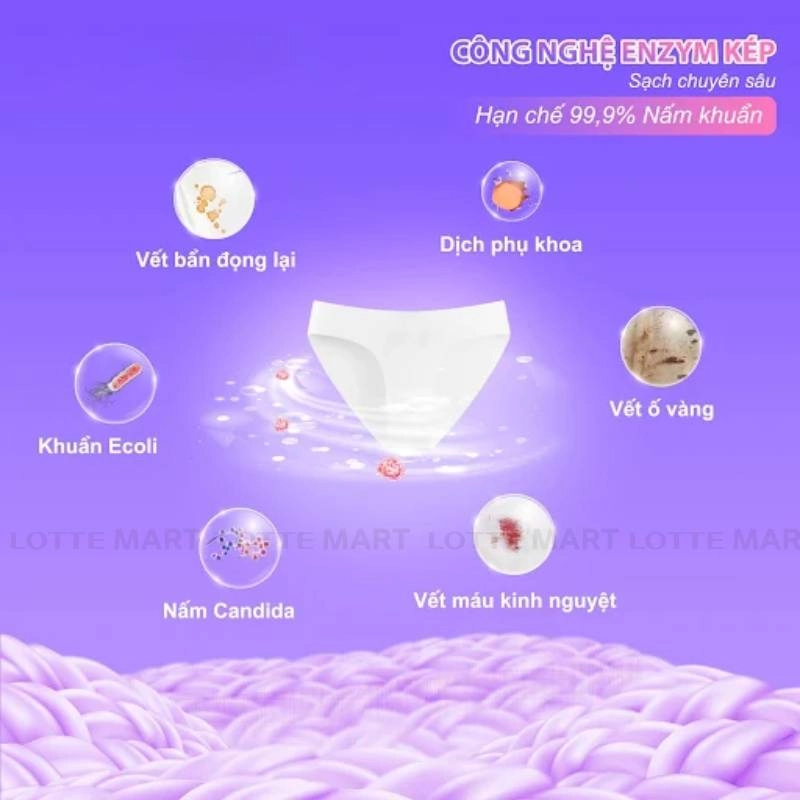 - Nước giặt sản xuất với công nghệ Enzyme kép mạnh mẽ làm sạch chuyên sâu đến 99,9% nấm khuẩn, vết bẩn, vết ố vàng, vết máu và dịch tiết trong chu kì, giữ cho đồ lót sạch nấm khuẩn bám trên bề mặt đồng thời ngăn ngừa các nguy cơ gây viêm nhiễm phụ khoa.