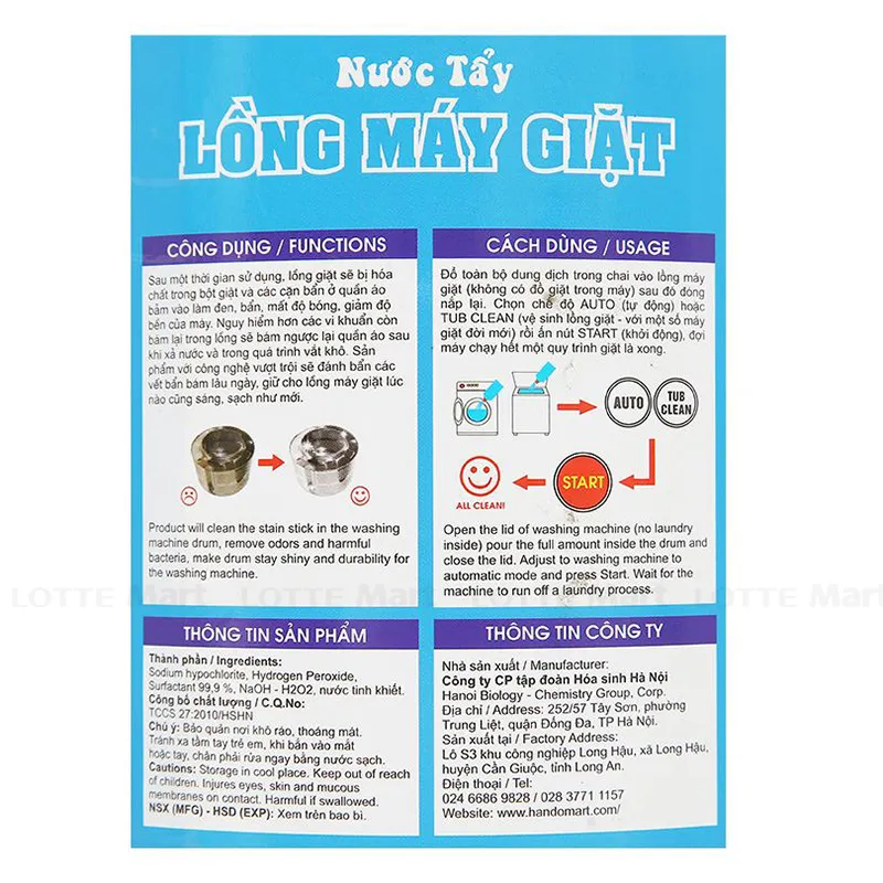 - Nước Tẩy Lồng Máy Giặt Hando Chai 800ml sẽ tẩy sạch mọi vết bẩn trong lồng máy giặt ( cả inox và nhựa ) trả lại độ bóng sáng sạch sẽ như mới, giúp máy giặt bền hơn, quần áo luôn sạch sẽ và tránh được mọi nguy cơ về vi khuẩn, ẩm mốc khi giặt.