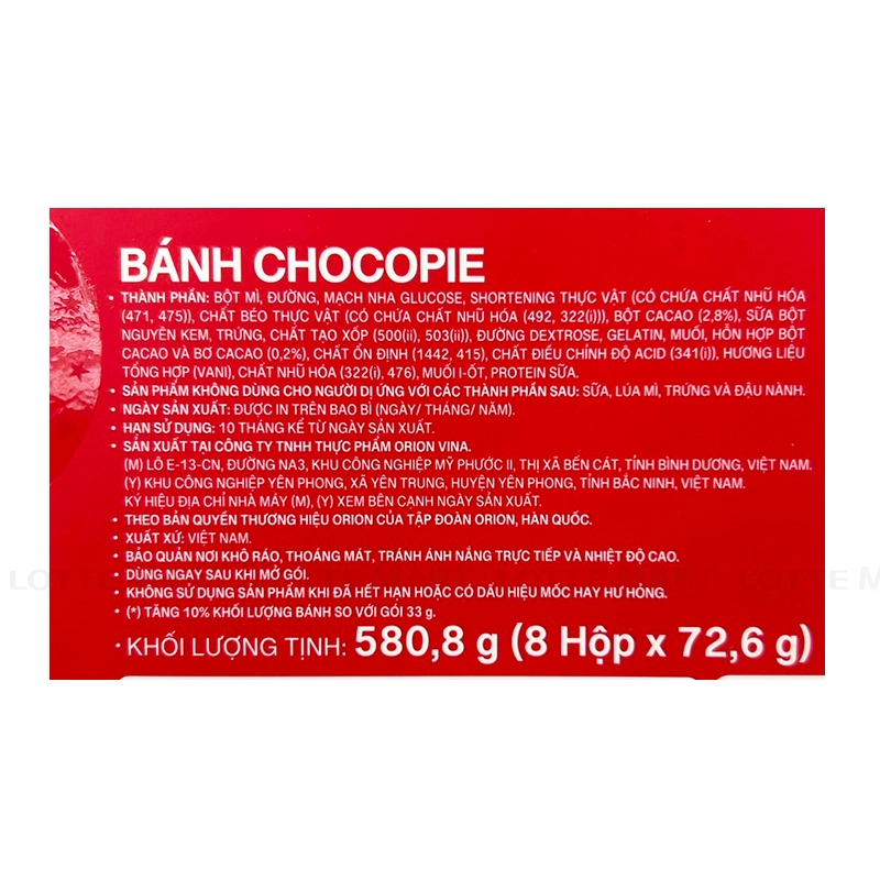 • Bánh Chocopie Hộp 580.8G 16P là chiếc bánh tuổi thơ của tất cả các bạn nhỏ. Chiếc bánh tròn màu nâu, cắn một miếng đầu tiên, sẽ cảm nhận được sự mềm mịn, bông xốp của hai lớp bánh và nhân marshmallow dẻo dẻo dai dai. Và đọng lại cuối cùng là vị socola đặc trưng, thơm ngon.