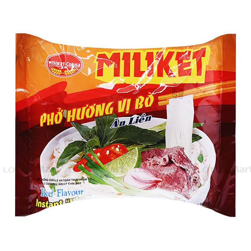 Phở Bò MILIKET 60G là sản phẩm ăn liền chất lượng cao được làm từ gạo, muối, đường, dầu cọ tinh luyện và gia vị được chọn lọc cẩn thận và sản xuất trên dây chuyền hiện đại khép kín, không sử dụng phụ gia độc hại nên tuyệt đối an toàn với sức khỏe người tiêu dùng.
