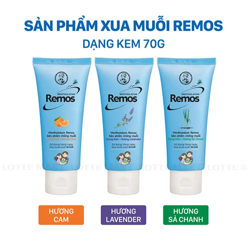 - Chứa Diethyltoluamide 15% đã được WHO và EPA chứng nhận hiệu quả và tính an toàn trong việc xua muỗi. Mentholatum Remos đạt hiệu quả xua muỗi suốt 8 giờ, còn có Aloe Vera và Vitamin E giúp giữ ẩm và nuôi dưỡng làn da. Tinh chất lô hội và vitamin E cũng góp phần giữ cho làn da của bạn được mềm mại, mịn màng, hương hoa thơm ngát lưu lại trên cơ thể khiến muỗi phải tránh xa. Sản phẩm dưới dạng kem dịu nhẹ, không nhờn rít, giúp xua đuổi muỗi và phòng ngừa các bệnh do muỗi gây ra trên bề mặt da, không dây vết, có mùi thơm dễ chịu.