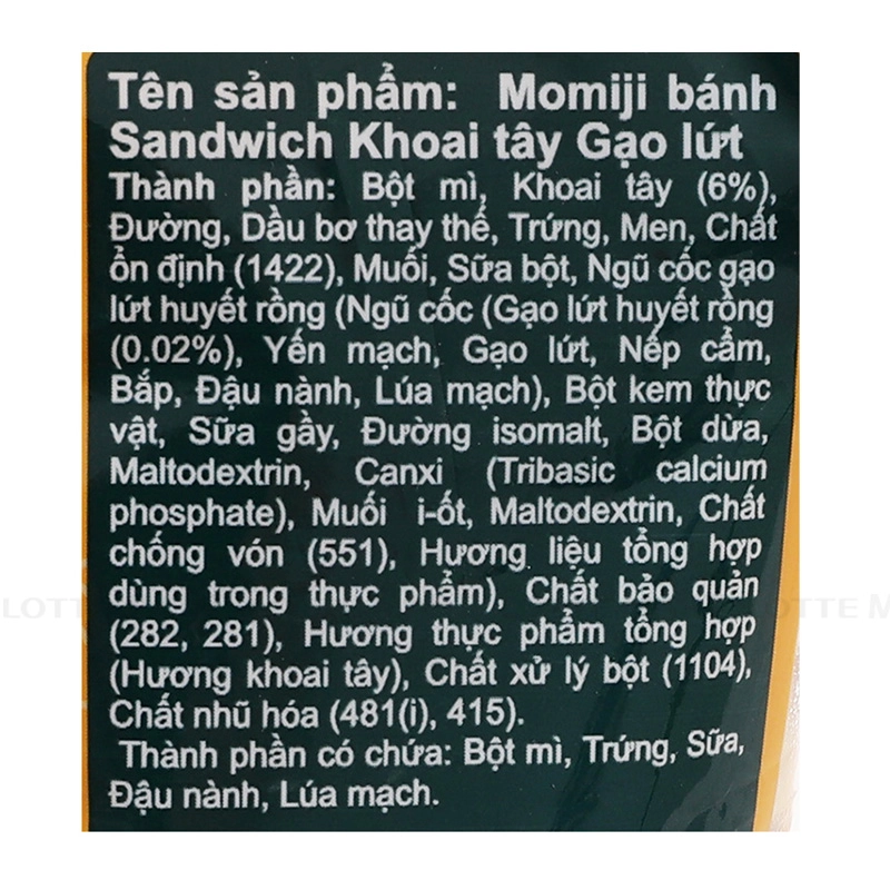 - Sandwich khoai tây gạo lứt Momiji mềm, mịn, hình dạng từng lát bánh vuông vắn, đều, đẹp, màu nâu nhạt, có mùi thơm của gạo lứt, khoai tây, vị nhạt. Sản phẩm chứa 6% tinh bột khoai tây, ngoài ra có bổ sung 0.6% gạo lứt tạo nên hương vị hấp dẫn cho bánh.