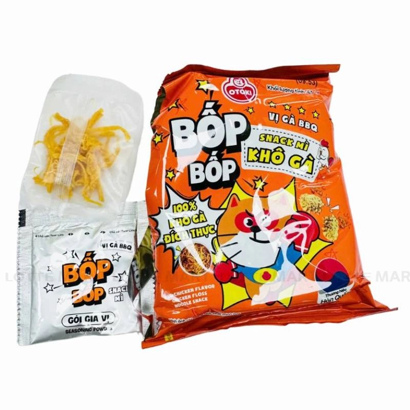 - Snack Mì Ottogi Bốp Bốp Vị Gà BBQ là món ăn vặt hoàn hảo, mang đến sự kết hợp độc đáo giữa sợi mì giòn tan và hương vị gà BBQ đậm đà.