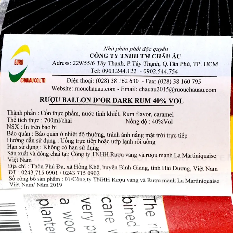 Rượu Rum Ballon D'Or Dark 40% ABV Chai 700ml