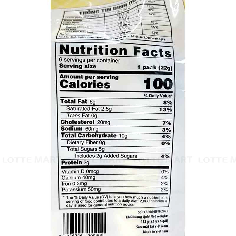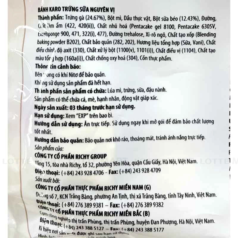- Trứng gà (24.67%), bột mì, dầu thực vật, bột sữa béo (12.43%), đường, đường trehalose, xi-rô ngô, hương liệu tổng hợp (sữa, vani),...