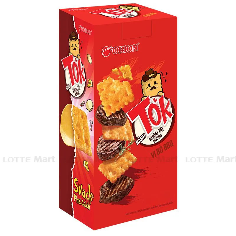 Orion giới thiệu đến người tiêu dùng dòng sản phẩm bánh khoai tây nướng TOK, dưới dạng cây, lần đầu tiên có mặt tại Việt Nam. Dưới lớp bao bì bắt mắt, mới lạ là cấu trúc bánh giòn tan, thơm lừng vị bò bbq đậm đà. Bánh Khoai Tây Nướng Tok Vị Bò BBQ phù hợp với mọi nhà, mọi lứa tuổi, đặc biệt là các bạn trẻ! Thành phần: Khoai Tây 33%, Đường, tinh bột khoai tây 6,9%, dầu dừa, gia vị bò bbq 4,5%… Hạn sử dụng: 8 tháng kể từ ngày sản xuất. Cách sử dụng: Ăn ngay sau khi mở bao bì. Bảo quản: Nơi khô mát, tránh ánh nắng mặt trời. Xuất xứ thương hiệu: Hàn Quốc. Nơi sản xuất: Việt Nam.