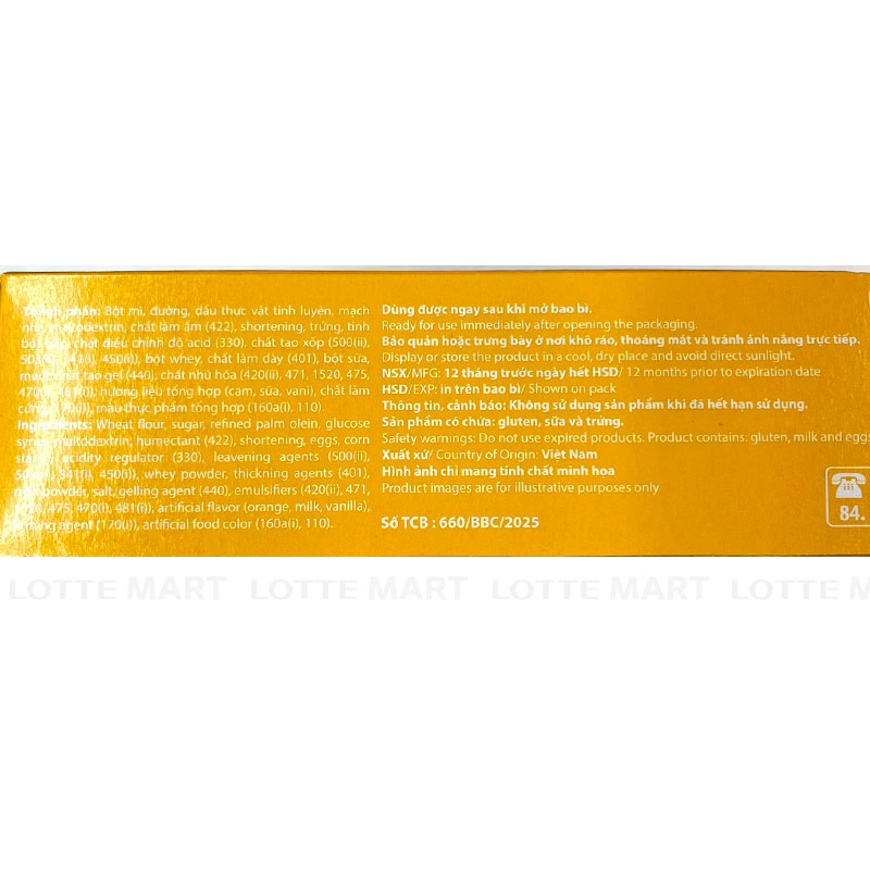 - Bột mì, đường, dầu thực vật, mạch nha, chất giữ ẩm (422), trứng (gà), sữa bột, chất làm dày (440, 401), chất điều chỉnh độ acid (330), muối, chất tạo xốp (500(ii)), hương liệu (cam, bơ) tổng hợp, màu thực phẩm tổng hợp (160a(i), 110