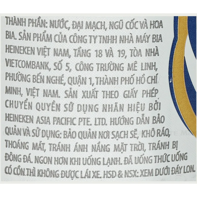 Thành phần bia: Nước, đại mạch, ngũ cốc, hoa bia. Độ cồn: 5%. Hướng dẫn sử dụng: Bia được uống trực tiếp trong lon hoặc đổ ra ly, ngon hơn khi uống lạnh, ở 10°C - 15°C. Lưu ý: Nếu mở lon phải dùng ngay hoặc để lạnh nếu muốn dùng lâu. Hạn sử dụng: 9 tháng kể từ ngày sản xuất. Bảo quản: Bảo quản nơi sạch sẽ, khô ráo, thoáng mát, tránh ánh nắng mặt trời. Xuất xứ: Việt Nam.