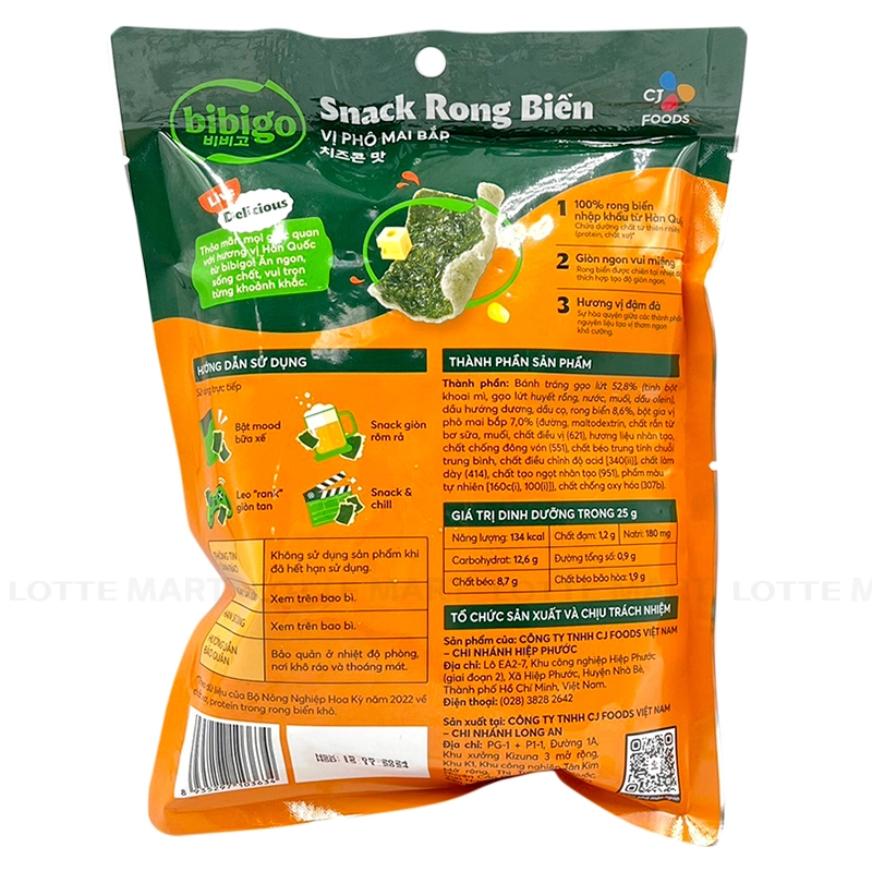 - Snack bibigo Phô Mai Bắp Gói 25G là sản phẩm đã khá quen thuộc với khách hàng Việt với vị giòn giòn của bánh tráng gạo lứt kết hợp với vị béo ngậy của phô mai và hương thơm từ bắp mang đến vị mới lạ. Ngoài ra, sản phẩm còn chứa nhiều chất dinh dưỡng từ thiên nhiên như vitamin, chất xơ, khoáng chất,...giúp bổ sung năng lượng.