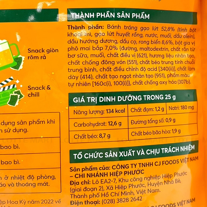 - Bánh tráng gạo lứt 55,2%, dầu hướng dương, dầu cọ, rong biển 6%, bột gia vị phô mai bắp 3,2%, chất chống oxy hóa (307b).