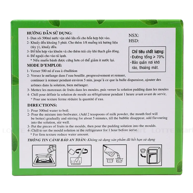 Bột Rau Câu Pha Sẵn Trà Xanh 3K Hộp 140G là một sản phẩm rất được nhiều người ưa chuộng. Sản phẩm có tính mát cùng hương trà xanh thơm ngon, đặc biệt thích hợp ăn trong những ngày nắng nóng. Bột rau câu có màu sắc tự nhiên đẹp mắt khiến các bé thêm phần thích thú khi thưởng thức. Thành phần: Đường, bột rau câu, hương trà xanh tổng hợp,…Công dụng: Dùng để làm rau câu. Bảo quản ở nơi khô thoáng, tránh ánh nắng trực tiếp.