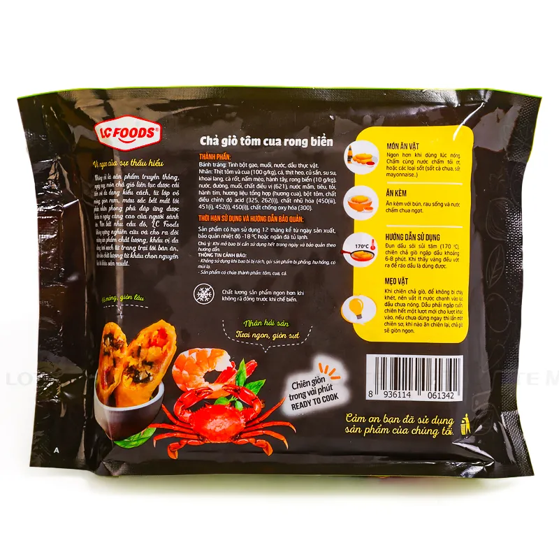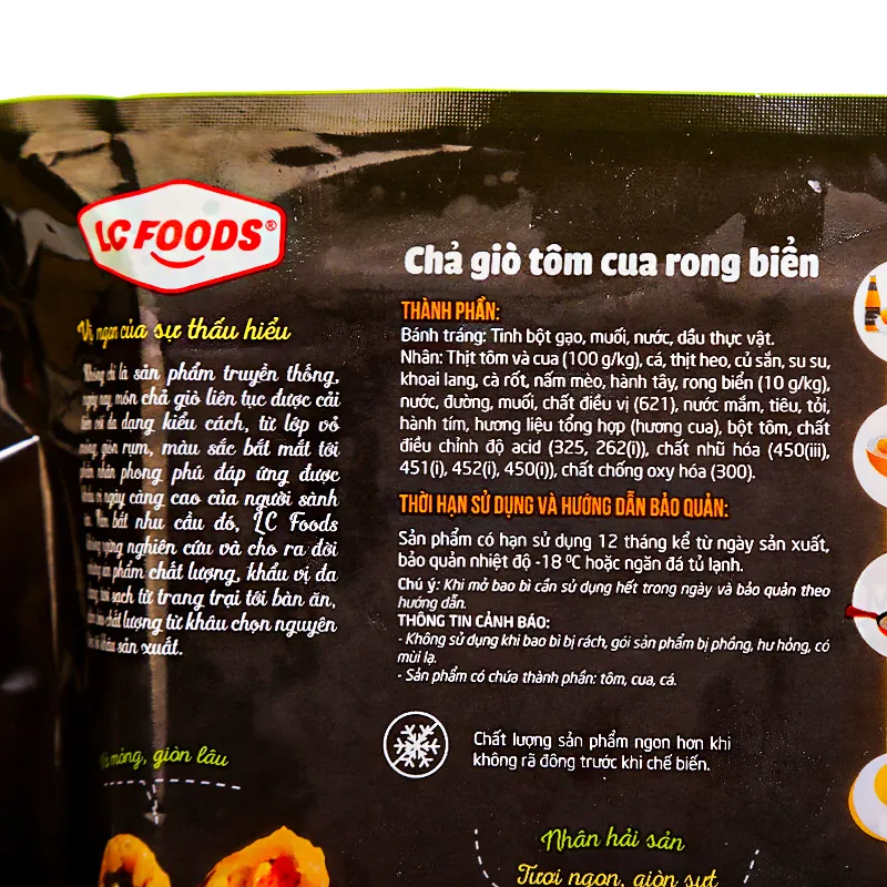 Chả Giò Tôm Cua Rong Biển La Cusina Gói 500g mang đến hương vị truyền thống, thơm ngon đến từ thương hiệu chả giò La Cusina. Sản phẩm là sự hài hòa giũa vị ngọt béo của tôm cua, rong biển và lớp vỏ giòn rụm, tan ngay trong miệng, thích hợp chấm kèm với nước chấm chua ngọt và rau sống. Thành phần: Thịt tôm và cua (100g/kg), thịt heo, bột gạo, bột mì, cà rốt, củ sắn, nấm mèo, hành tây, rong biển (10g/kg), nước, đường, muối, nước mắm, tiêu, tỏi, hành tím, chất điều vị (621), hương cua tổng hợp, bột tôm, chất điều chỉnh độ acid (325, 262i), chất chống oxy hóa (316), chất nhũ hóa (471), chất làm dày (466). Cách dùng: Chiên giòn trong 6-8 phút và thưởng thức. Khi mở bao bì cần sử dụng hết trong ngày và bảo quản -18 độ C hoặc trong ngăn đông tủ lạnh. Hướng dẫn bảo quản: Bảo quản ở -18 độ C hoặc trong ngăn đông tủ lạnh. Xuất xứ: Việt Nam.