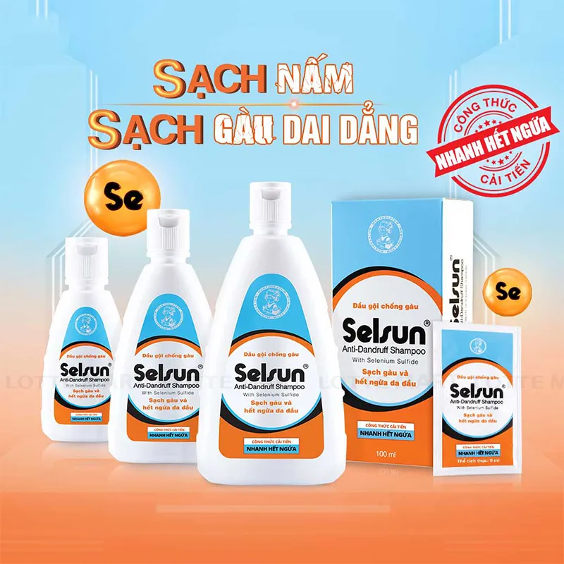 - Dầu gội Selsun mang công thức cải tiến với 1% Selenium Sulfide mang hiệu quả vượt trội trong việc ngăn ngừa nấm gây gàu, làm sạch tóc và da đầu hiệu quả.