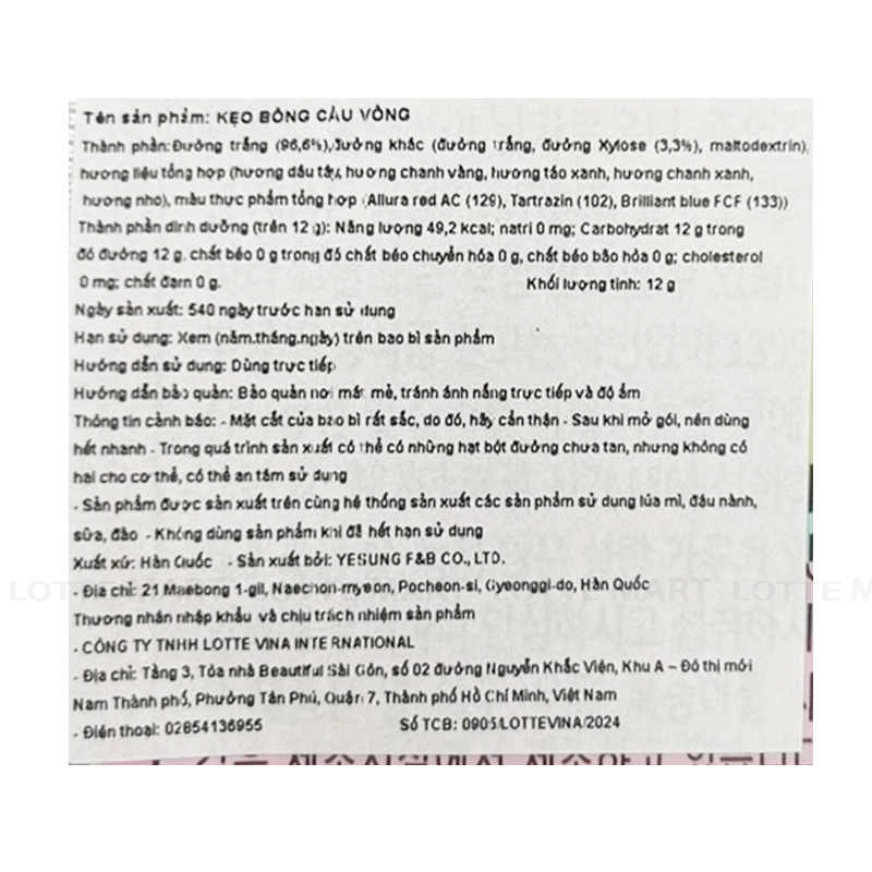 • Đường trắng (96.6%), đường khác (đường trắng, đường Xylose (3.3%), maltodextrin), hương liệu tổng hợp (hương dâu tây, hương chanh vàng, hương táo xanh, hương chanh xanh, hương nho),...