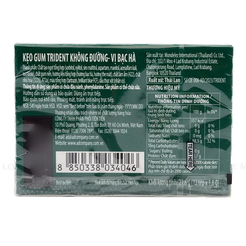 • Kẹo Gum Trident Không Đường Bạc hà Hộp 12 Tép có bạc hà the mát cùng thành phần tự nhiên nên bạn có thể sử dụng thường xuyên, an toàn với sức khỏe, đồng thời giúp bạn tỉnh táo, giảm căng thẳng, mệt mỏi.
