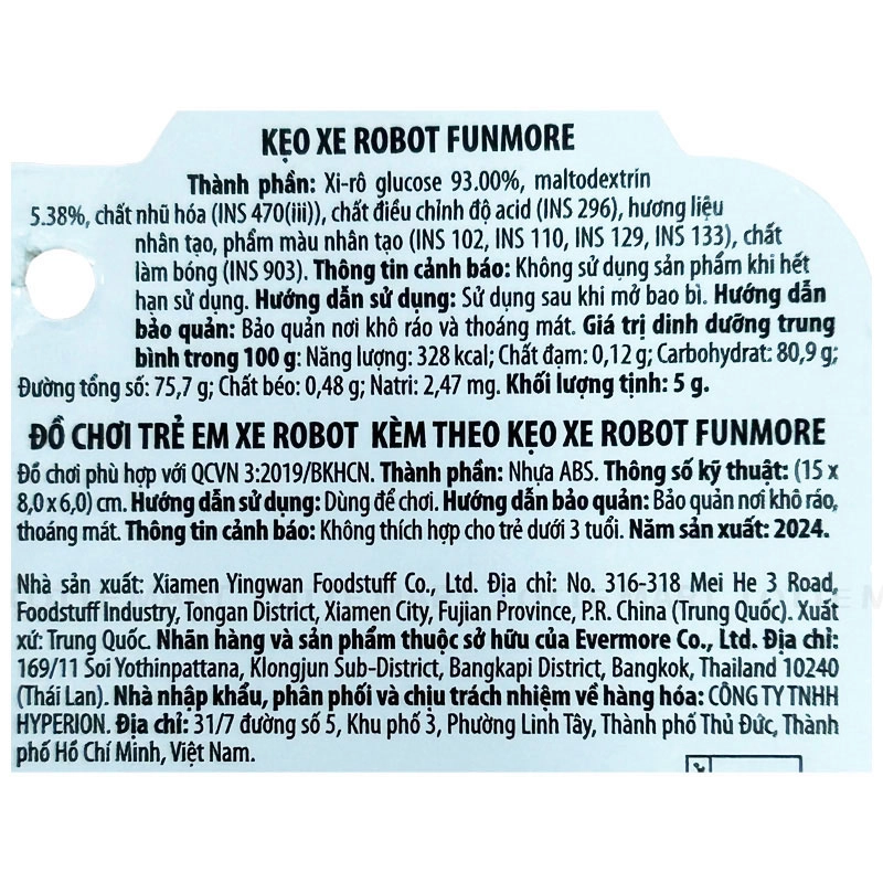 - Kẹo Đồ Chơi Funmore Hình Robot Biến Hình là sản phẩm được thiết kế 2 trong 1 gồm kẹo và đồ chơi robot biến hình dành cho bé, vừa ăn vừa chơi, rất tiện lợi, có thể là món quà để ba mẹ tặng bé yêu trong những dịp lễ.