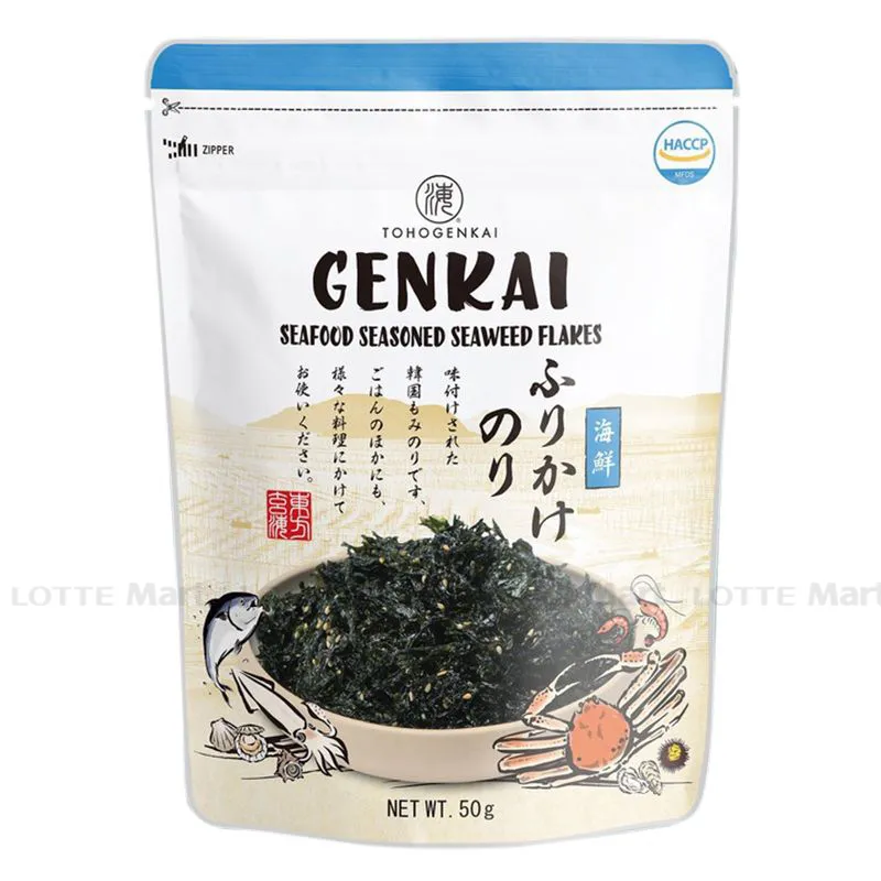 - Rong Biển Vụn Trộn Cơm Cho Trẻ Genkai Vị Hải Sản thơm ngon, giòn tan trong miệng với hương vị rong biển hòa cùng mè rang và vị hải sản khiến bữa ăn của bé và cả gia đình được trọn vẹn dinh dưỡng, chuẩn vị thơm ngon.
