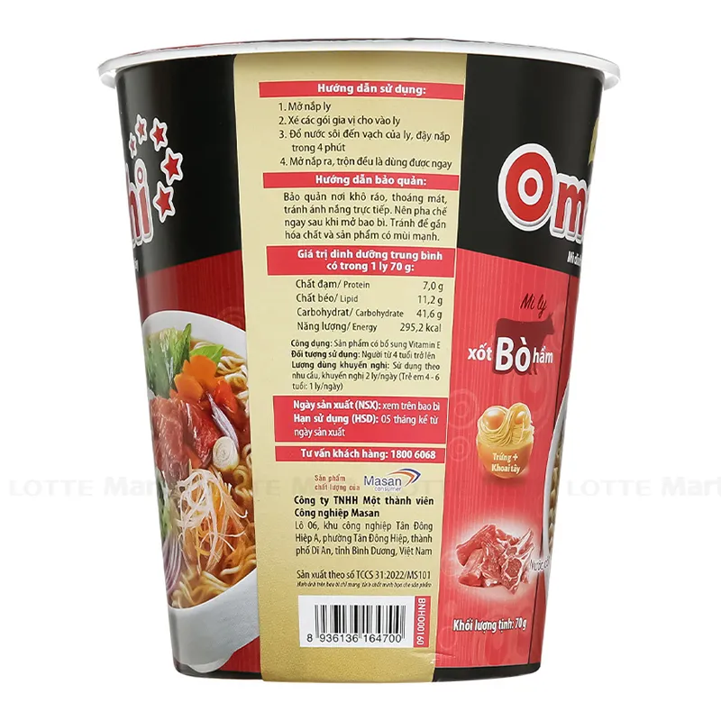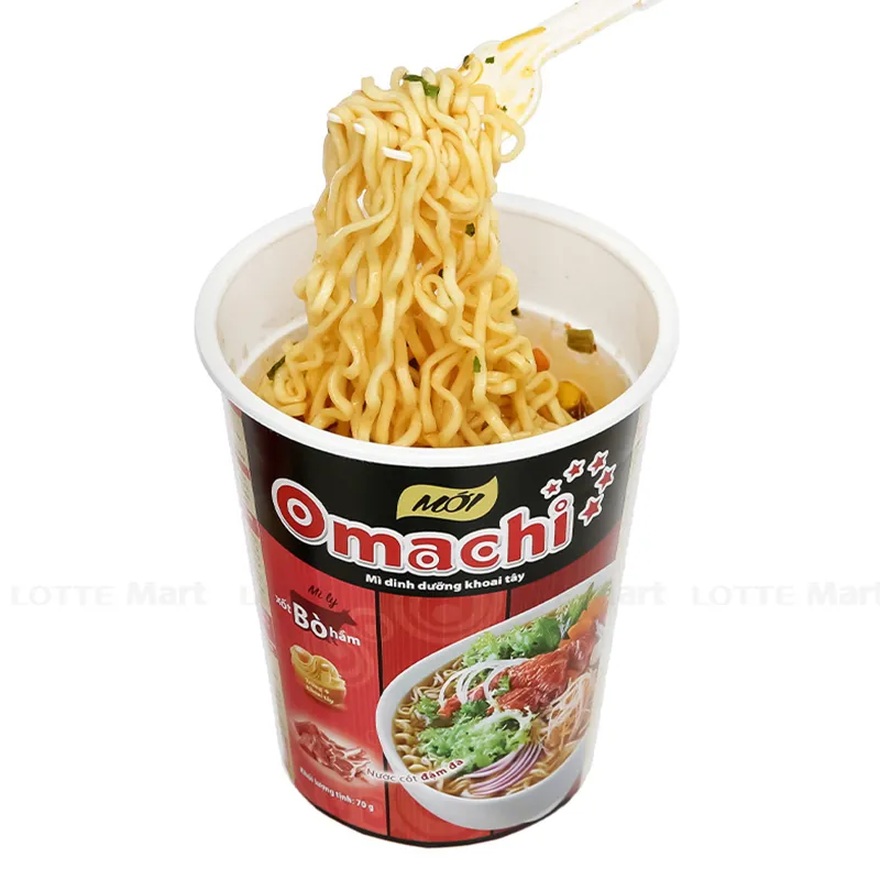 - Mì Omachi Xốt Bò Hầm Ly 70G có sợi mì vàng dai được chế biến từ trứng và khoai tây đắm chìm trong nước súp bò hầm đậm đà cùng hương thơm nứt mũi tạo ra siêu phẩm mì ngon đến khó quên sau lần đầu thưởng thức.