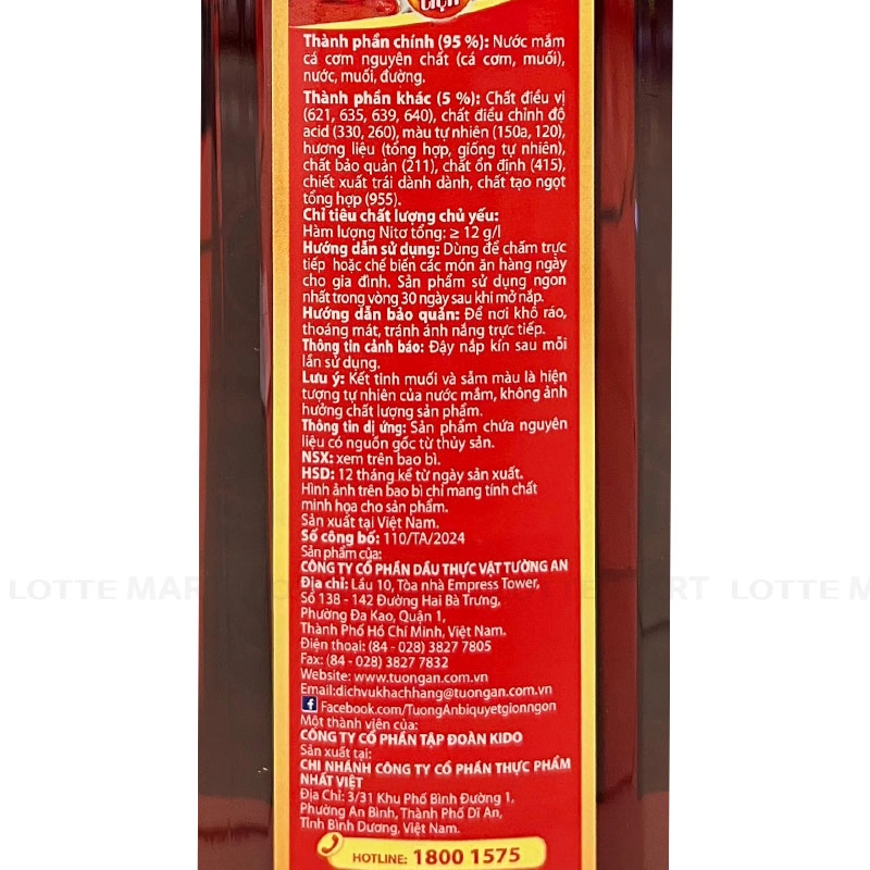 Nước Mắm Tường An Ngư Phát Nhãn Đỏ được làm từ nước mắm cá cơm nguyên chất, tươi ngon, kết hợp cùng muối, nước và đường, mang đến hương vị truyền thống và chất lượng tinh khiết.