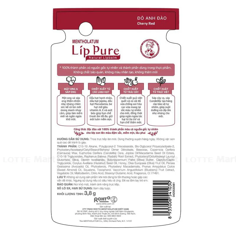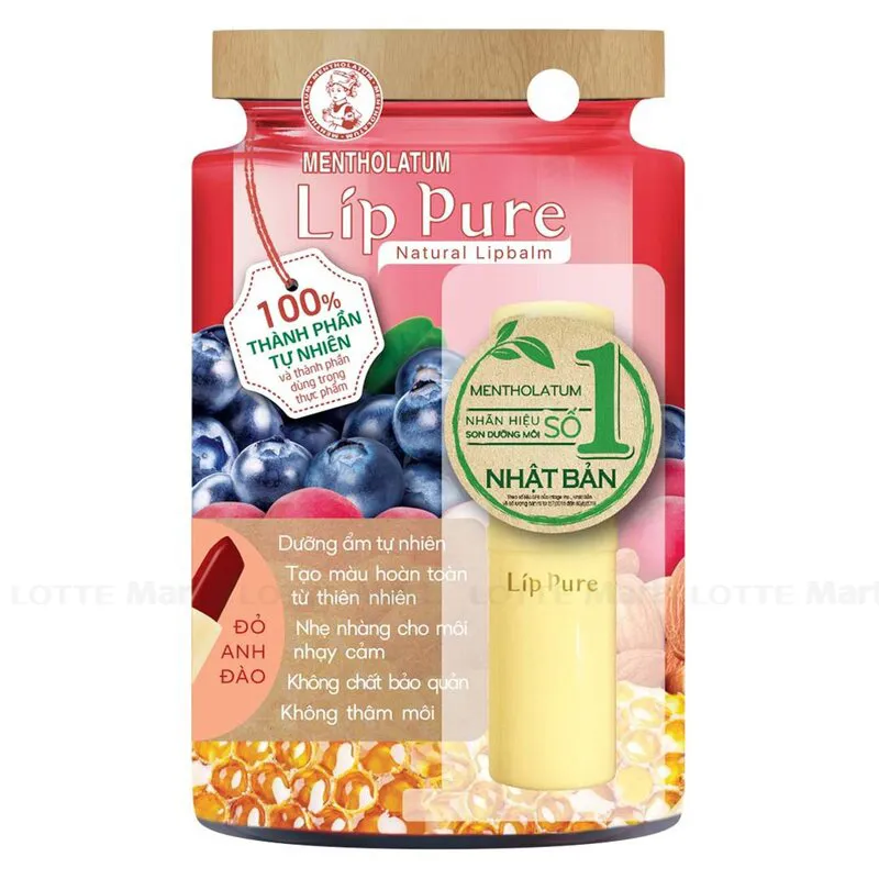 Son Dưỡng Có Màu Lip Pure Natural Lipbalm Màu Cherry Red Đỏ Anh Đào Thỏi 3.8g là dòng son dưỡng đến từ thương hiệu mỹ phẩm Lip Pure thuộc tập đoàn Rohto của Nhật Bản, với thành phần từ tự nhiên và thành phần dùng trong thực phẩm lành tính cho cả môi mỏng manh, nhạy cảm. Sắc màu son được tạo nên từ quả việt quất và củ cải đỏ mang lại màu son tự nhiên, thời thượng giúp bạn vừa dưỡng môi mềm mọng vừa trông tươi tắn, rạng ngời. Màu son lên đậm màu, mềm mịn và lâu phai.