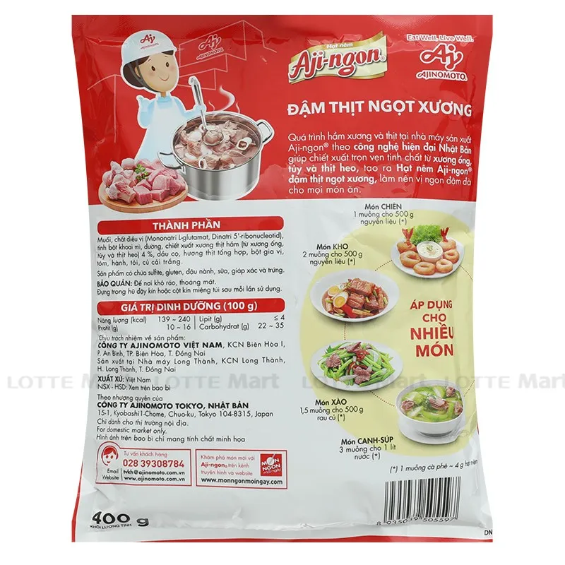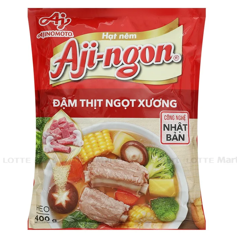 Hạt Nêm Aji-ngon Vị Heo 400G với chiết xuất cô đặc từ thịt, xương ống và xương sườn, cho món ăn thêm ngon và đậm đà với hương vị tự nhiên.