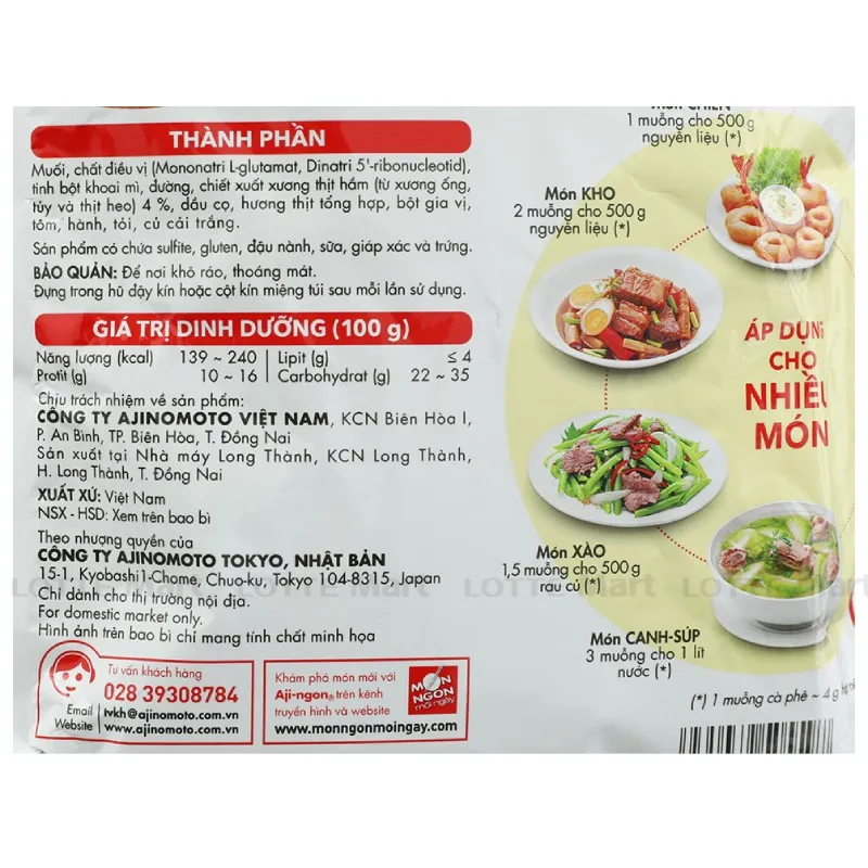 Hướng dẫn sử dụng: Dùng để tẩm ướp, xào, nấu... Món chiên: 1 muỗng/500g thịt, cá. Món xào: 1.5 muỗng/500g rau, củ. Món canh: 3 muỗng/1 lít nước canh. Món kho: 2 muỗng/500g thịt, cá.