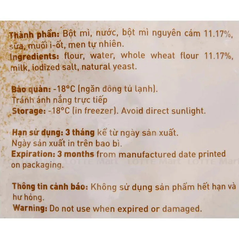 - Bột mì, nước, bột mì nguyên cám 11.17%, sữa, muối i-ốt, men tự nhiên.