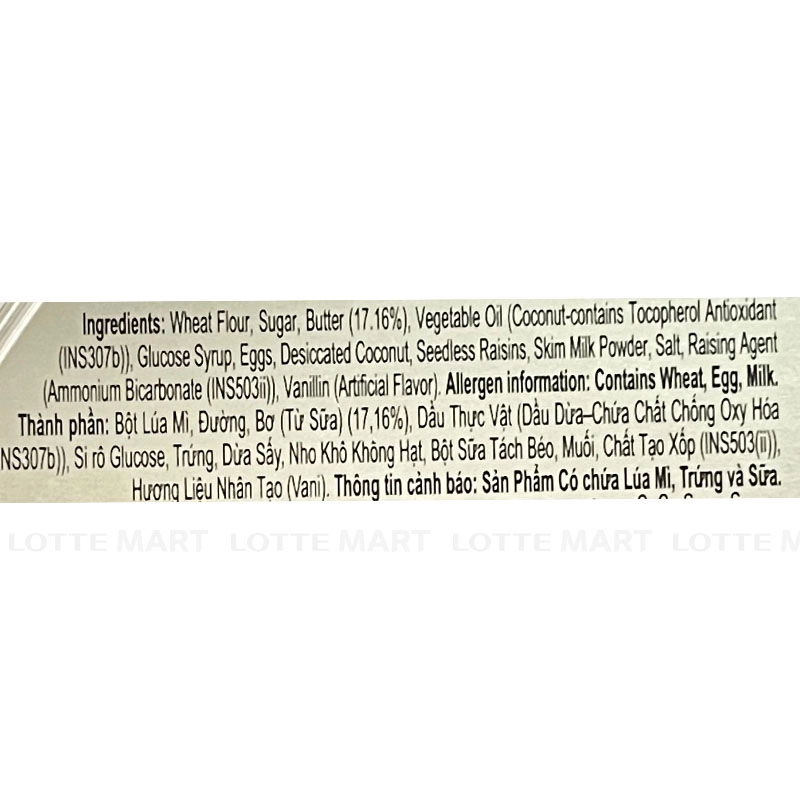 Thành phần: Bột lúa mì, bơ, đường, sữa, dừa, trứng, nho, bột muối, bột nở, vani…