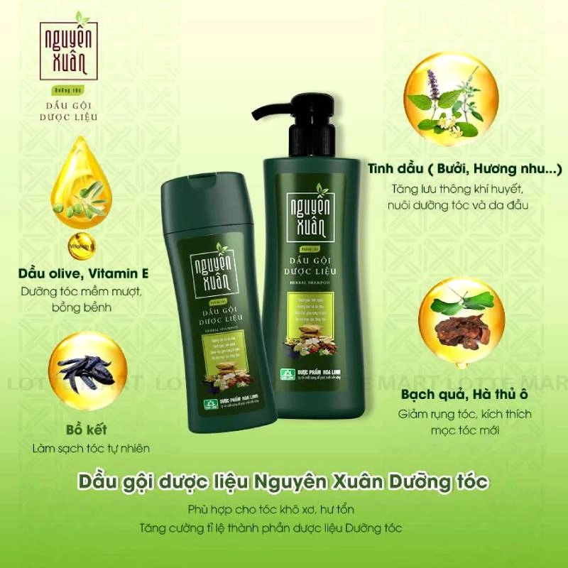 - Dầu Gội Dược Liệu Nguyên Xuân Dưỡng Tóc Phục Hồi Hư Tổn là dầu gội được nghiên cứu dựa trên kinh nghiệm dân gian, kết hợp với những nghiên cứu mới của khoa học hiện đại. Sản phẩm được kết hợp từ tinh hoa 13 vị dược liệu cổ truyền như Bạch Quả, Hà Thủ Ô, Bồ Kết, Mần Trầu, Hoắc Hương…đặc biệt bổ sung các thành phần dưỡng tóc chuyên biệt.