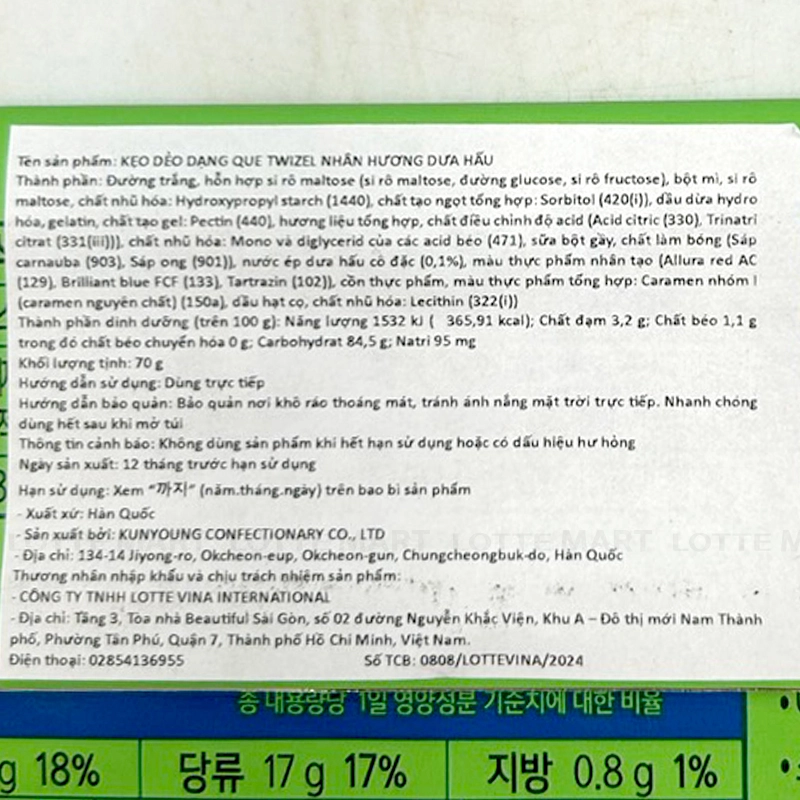 - Kẹo Dẻo Que Vị Dưa Hấu Twizel mang đến cho bạn một trải nghiệm ngọt ngào và đầy mới mẻ với hương vị dưa hấu tươi mát. Với thiết kế xoắn ốc bắt mắt, mỗi miếng kẹo không chỉ hấp dẫn về hình thức mà còn quyến rũ vị giác với vị ngọt thanh, chua nhẹ và hấp dẫn với hương thơm đặc trưng của dưa hấu.