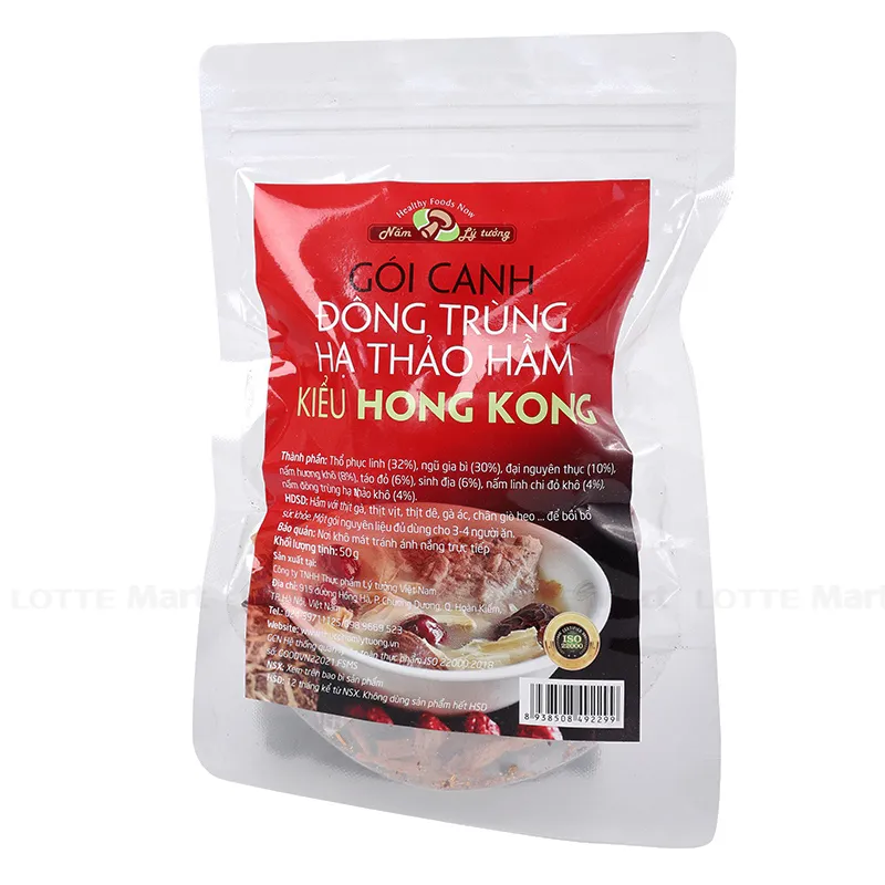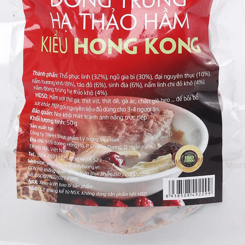 Gói Canh Đông Trùng Hạ Thảo Hầm Kiểu Hong Kong bao gồm các thành phần nấm, hạt và thảo quả dùng để hầm các loại canh như gà, vịt, dê, chân giò heo để bồi bổ sức khỏe hoặc chỉ đơn giản để dùng thanh nhã, đổi món.