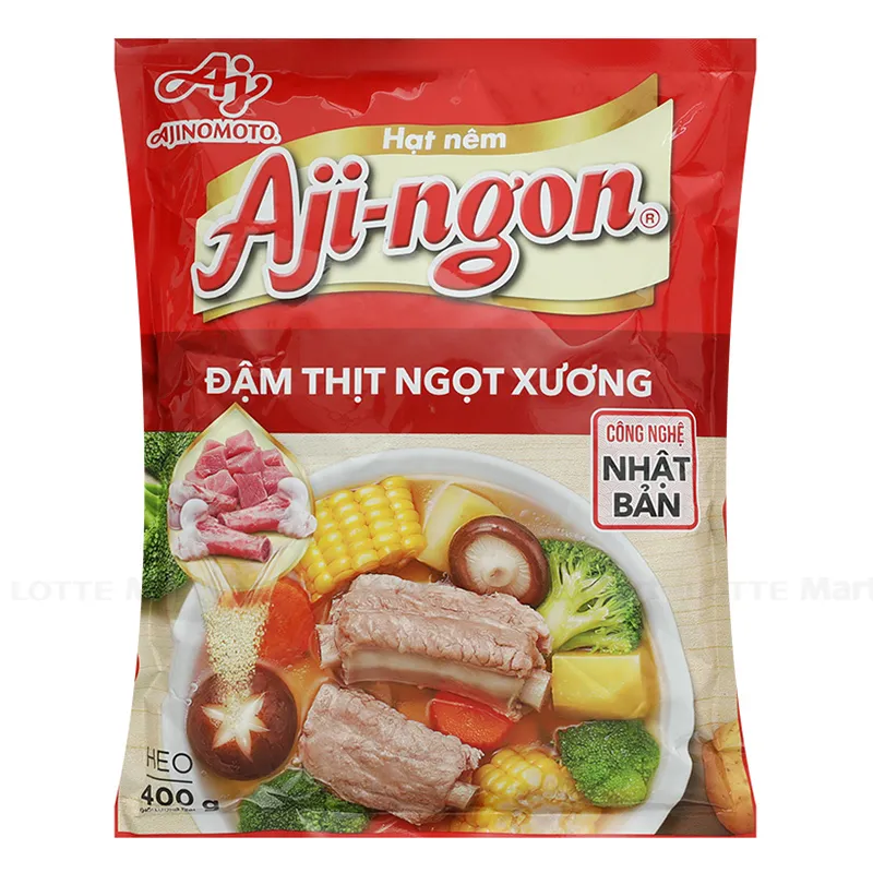 Hạt Nêm Aji-ngon Vị Heo 400G với chiết xuất cô đặc từ thịt, xương ống và xương sườn, cho món ăn thêm ngon và đậm đà với hương vị tự nhiên.