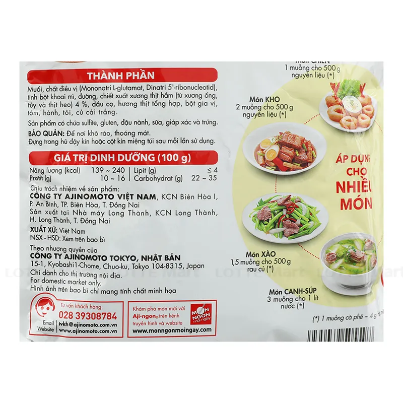 Hướng dẫn sử dụng: Dùng để tẩm ướp, xào, nấu... Món chiên: 1 muỗng/500g thịt, cá. Món xào: 1.5 muỗng/500g rau, củ. Món canh: 3 muỗng/1 lít nước canh. Món kho: 2 muỗng/500g thịt, cá.