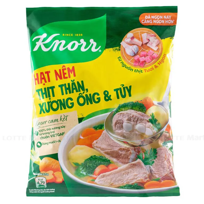 - Knorr là thương hiệu hạt nêm và nước dùng SỐ 1 THẾ GIỚI (*). Với công thức cải tiến, hạt nêm Knorr mới tăng 50% xương thịt với nguồn thịt thăn chất lượng sản xuất từ bột thịt thăn, chiết xuất xương ống và tủy từ nguồn thịt heo tươi sống được hầm trong nhiều giờ liền cùng với thành phần muối i-ốt an toàn cho sức khỏe, mang đến bữa ăn tươi ngọt và tròn vị.