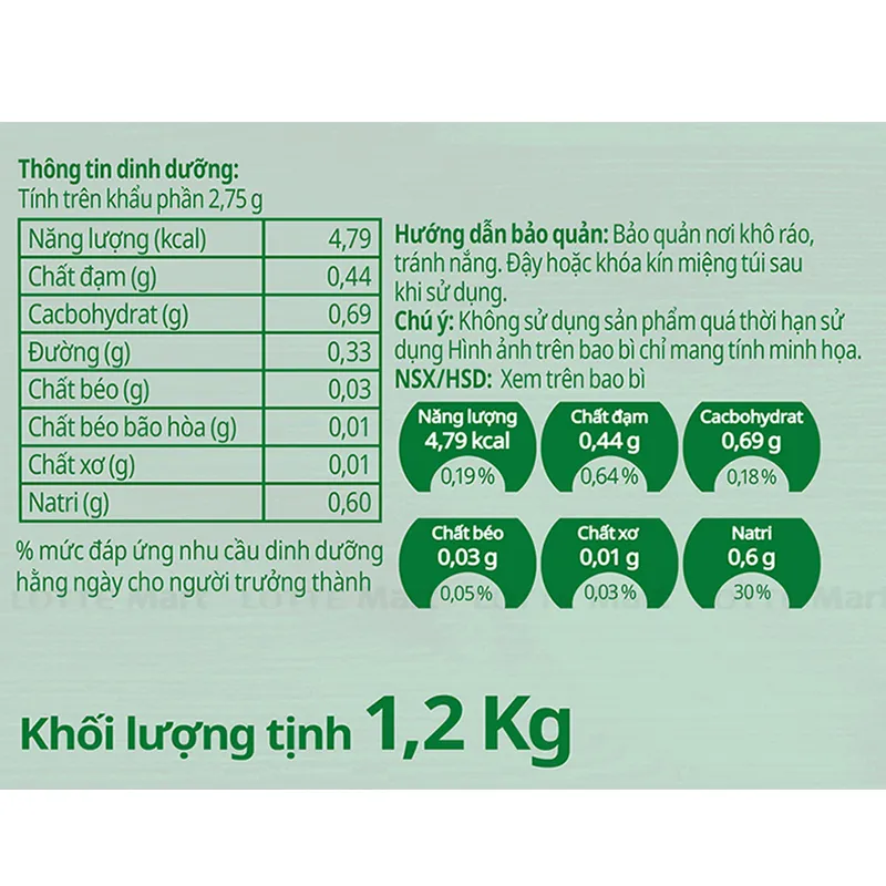 Hướng dẫn bảo quản: Bảo quản nơi khô ráo, tránh nắng. Đậy hoặc khóa kín miệng túi sau khi sử dụng.